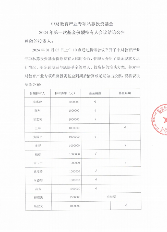 中财教育产业专项私募投资基金份额持有人临时会议通知