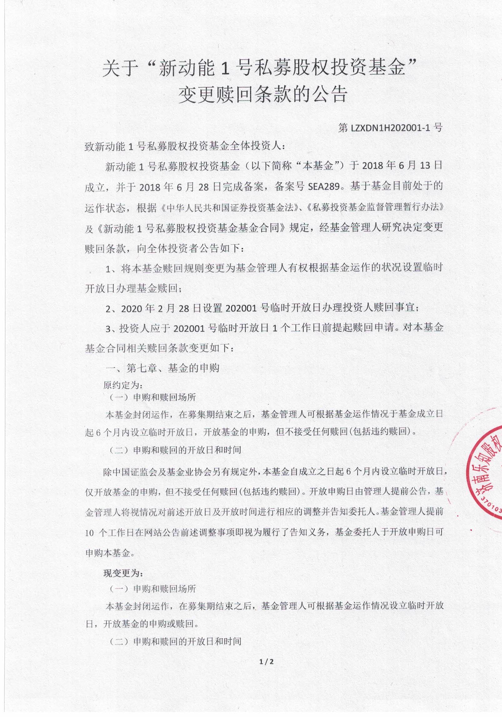 新动能1号私募股权投资基金 份额持有人会议临时会议通知函