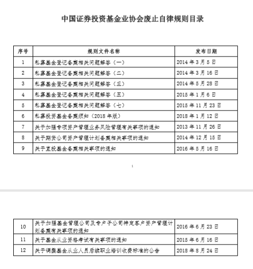 为了进一步完善自律规则体系,中国证券投资基金业协会对截至2019年12月31日的自律规则进行了清理,决定对第一批自律规则予以废止,共计12项。现将废止自律规则目录予以公布(附件)。